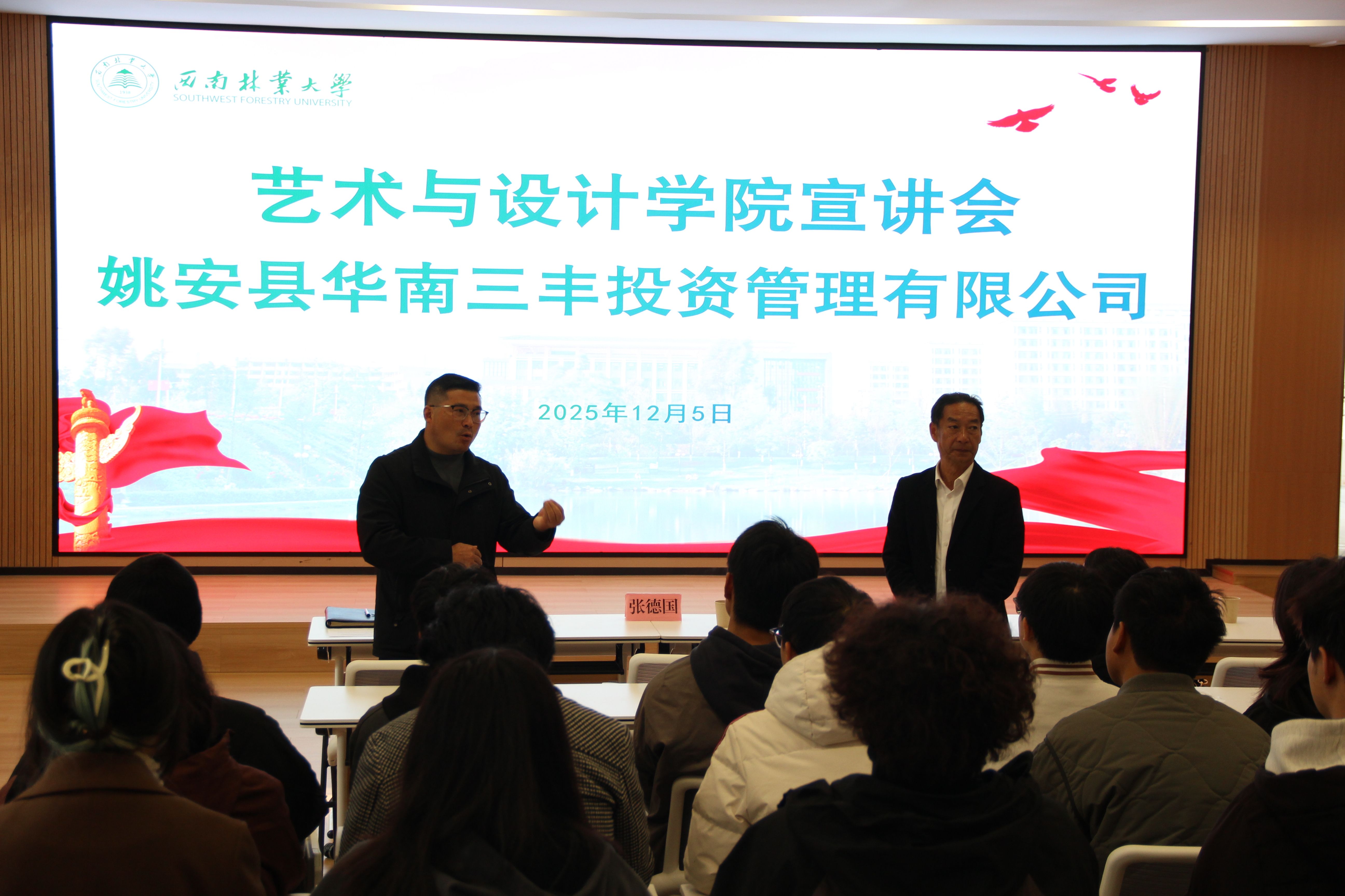 12月5日上午,由永利3044集团官网主办的姚安县华南三丰投资管理有限公司校园招聘专场宣讲会在设计楼106举行。公司党委书记张德国、党委副书记李浩、公司总经理陈远峰一行及2026届毕业生共80余人参会。宣讲会由李浩主持。