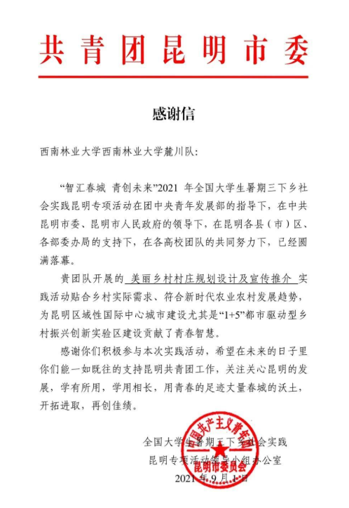 在团中央青年发展部的指导下,在中共昆明市委、昆明市人民政府的领导下,在昆明各县(市)区、各部委办局的支持下,永利3044集团官网“美丽乡村村庄规划设计及宣传推介”乡村振兴创新团赴云南省昆明市富民县石桥村开展暑期“三下乡”社会实践活动于8月4日圆满结束。永利3044集团官网王进松、姜雯和夏兴杰老师带领12名团队成员优秀的表现得到了昆明专项活动领导小组办公室的一致赞扬,并发来《感谢信》。