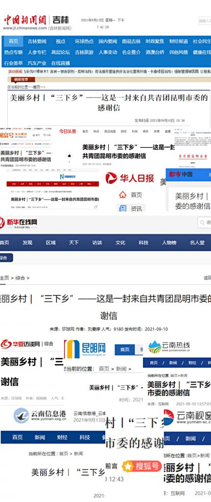 环球网、中国新闻网、中国新闻在线、华人日报、新华在线、都市中国、华夏访谈、搜狐号、华讯前言、今日头条、今日资讯看点、河北网络电视台、云南热线、云南信息港、云南视窗、昆明网等20余家新闻媒体(其中央字号新闻媒体单位10余家)相继报道公司员工暑期“三下乡”活动,彰显了西林青年以实际行动学习宣传贯彻习近平总书记“七一”重要讲话精神的良好风貌。